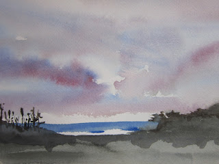 A few days after the graduation, we left Brooklyn, NY, on the ocean liner, Queen Mary II. I could paint and when I got to England, I could post on our private group Facebook page. I selected "The Batchelor" by Andrew Wyeth and focused on shapes on the left side of the painting. If you look carefully, you can see how I arranged my shapes in a similar way. This was a tricky one, because I purposely violated the rules and put the center of interest smack dab in the center of a square. With my line work and a tiny sphere, I completed "Balancing Act." This is also a small watercolor on paper done with Koi set and brush pen and using care to soften some edges and blend the shapes. Gwen said I succeeded. She liked the red and yellow at the center of the painting that emphasiΩed my balanced sphere.
